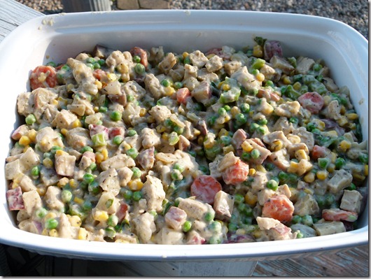 When I came home, I poured the thoroughly coated veggies into a casserole dish.